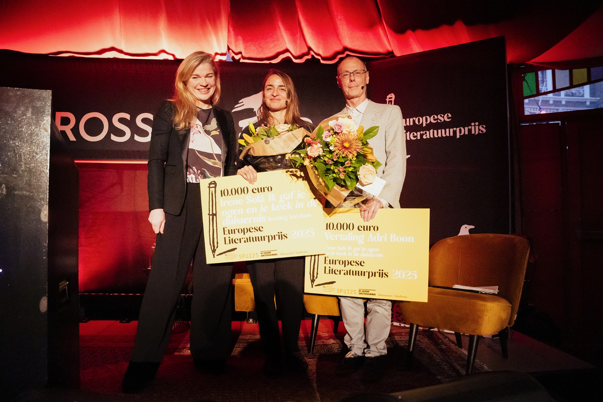 | Irene Solà ontving , met haar vertaler Adri Boon, de Europese Literatuurprijs 2025 voor de Nederlandse vertaling van Ik gaf je ogen en je keek in de duisternis. Schrijver Irene Solà en vertaler Adri Boon hebben op 8 november de Europese Literatuurprijs 2025 ontvangen voor de roman Ik gaf je ogen en je keek in de duisternis (uitgeverij Cossee). Zij kregen de prijs uit handen van Romkje de Bildt, directeur-bestuurder van het Nederlands Letterenfonds, en juryvoorzitter Niña Weijers tijdens een programma op Crossing Border in Den Haag. De Europese Literatuurprijs bekroont de beste hedendaagse Europese roman die in het voorgaande jaar in Nederlandse vertaling is verschenen. Zowel de auteur als de vertaler van het winnende boek worden bekroond en ontvangen € 10.000 aan prijzengeld. (Nederlands Letterenfonds) |